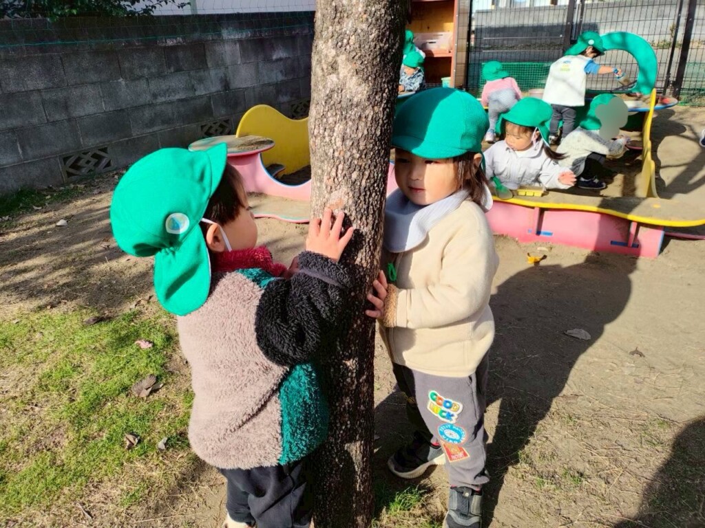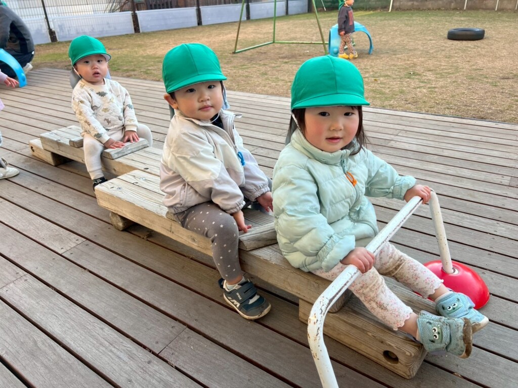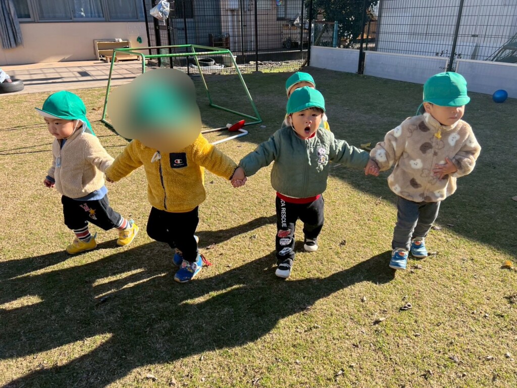 寒さにも負けず元気いっぱい。保育士とかけっこなど体を動かして遊び友だちとの関わりも増えました。友だち2人で手を繋いでいると“一緒に繋ごう!”と手を伸ばしてアピールする子ども達。気付くと「いいよー!」とだんだんと手を繋ぐ人数が増えていく可愛い子どもたちです♡