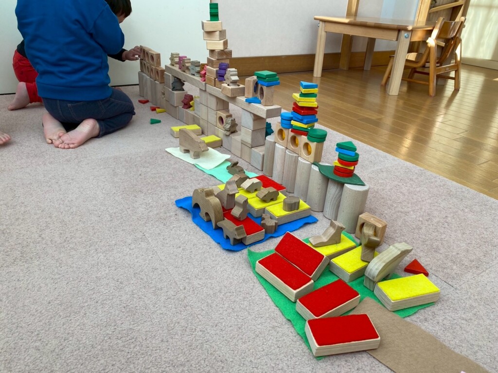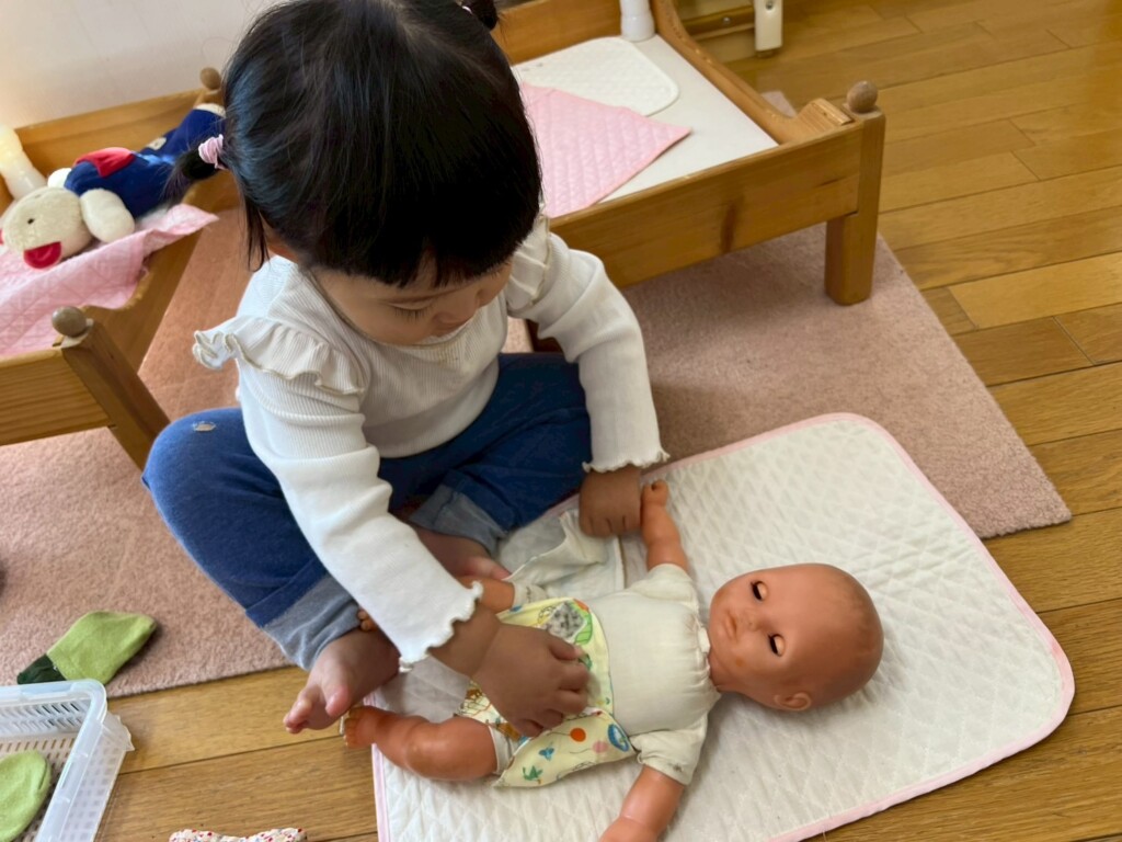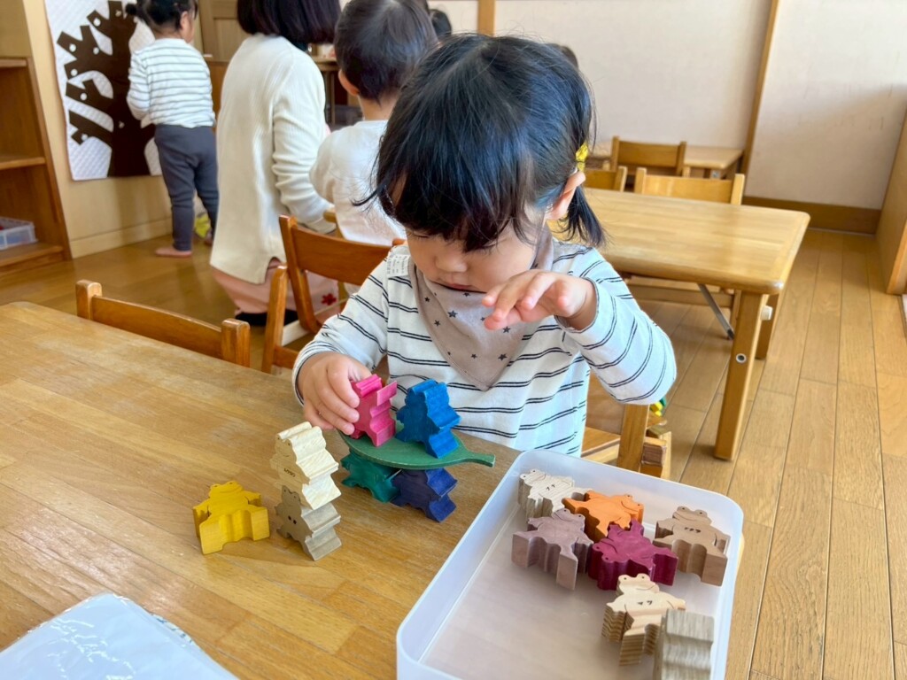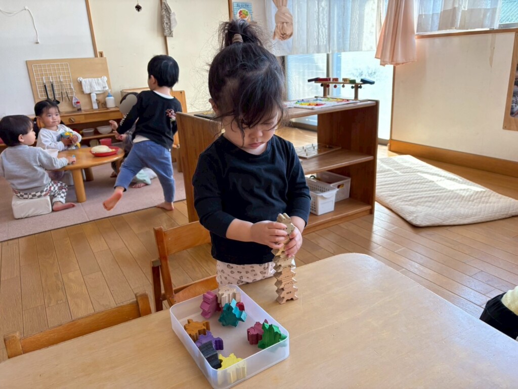 指先を上手に使って遊べることが増えてきました。スナップボタンやひも通しを一人でも出来るようになりました。指先を使う遊びだけでなく積み重ねる遊びにも夢中になり成功すると「やったー!」「できたよー!」と嬉しそうに教えてくれます。途中で倒れてしまっても「もう一回!」と何度も挑戦することもあり大きな成長を感じられるようになりました。