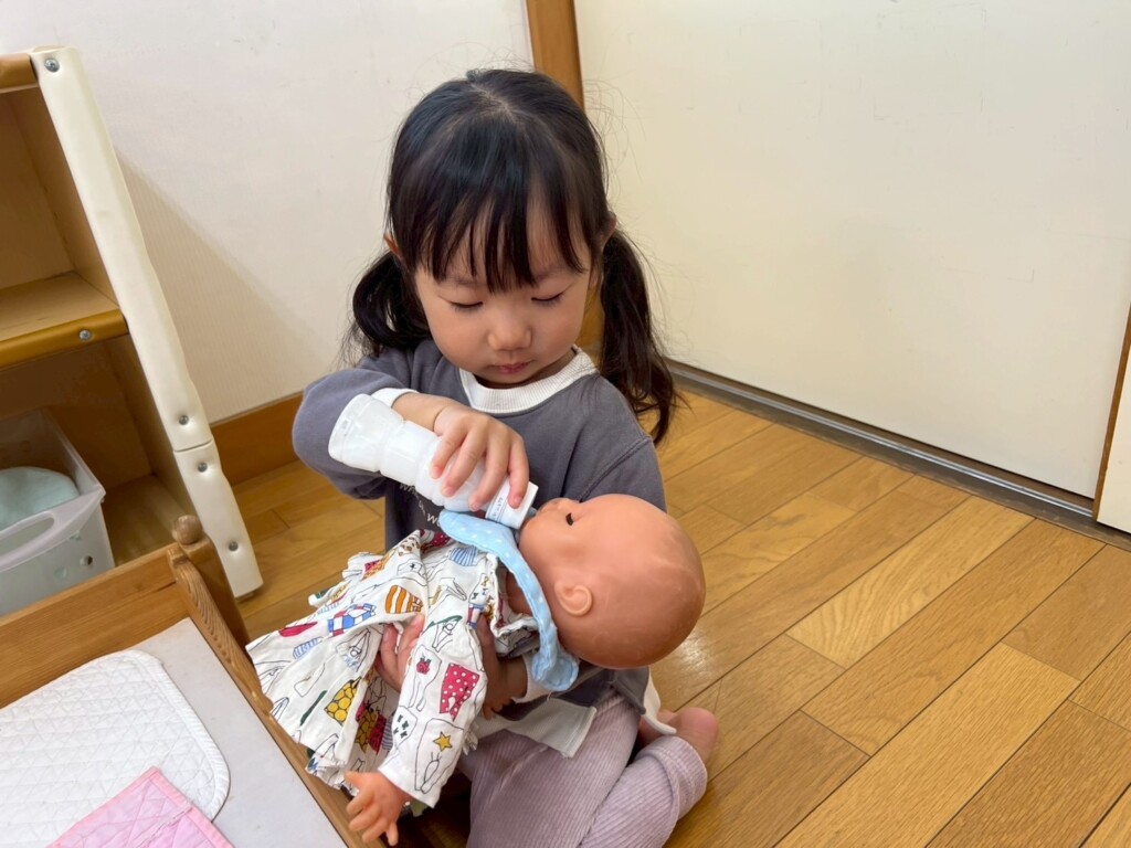 1組は“いちごちゃん”で、2組は“にしくん”です。ミルクを飲ませてあげたり、おむつ交換も上手な子どもたちです。