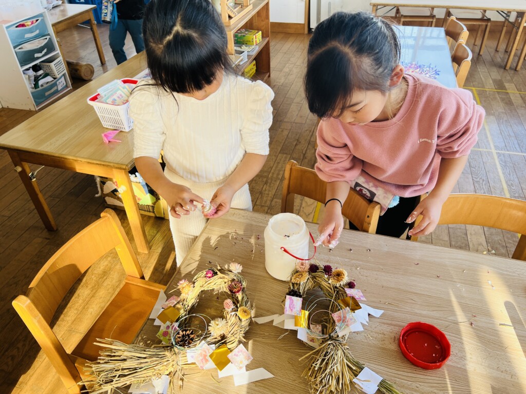 しめ飾り作りは、友達や保育士と一緒に協力し合いながら藁をねじったり、紙垂や木の実、ドライフラワーなどを飾りました。