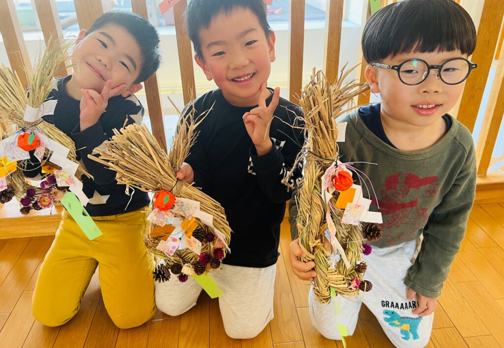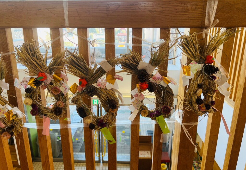 しめ飾りは廊下に飾り、他クラスの友達や保護者などから「素敵な しめ飾りができたね😊」「可愛いね!」等と声を掛けられて、嬉しそうでした😊
