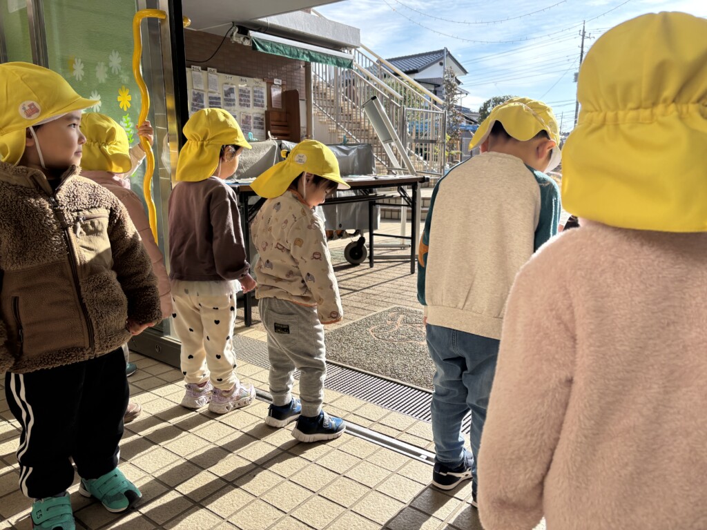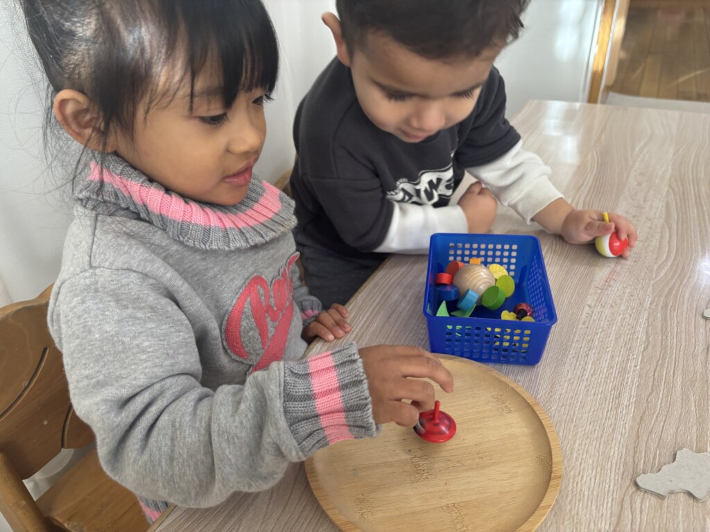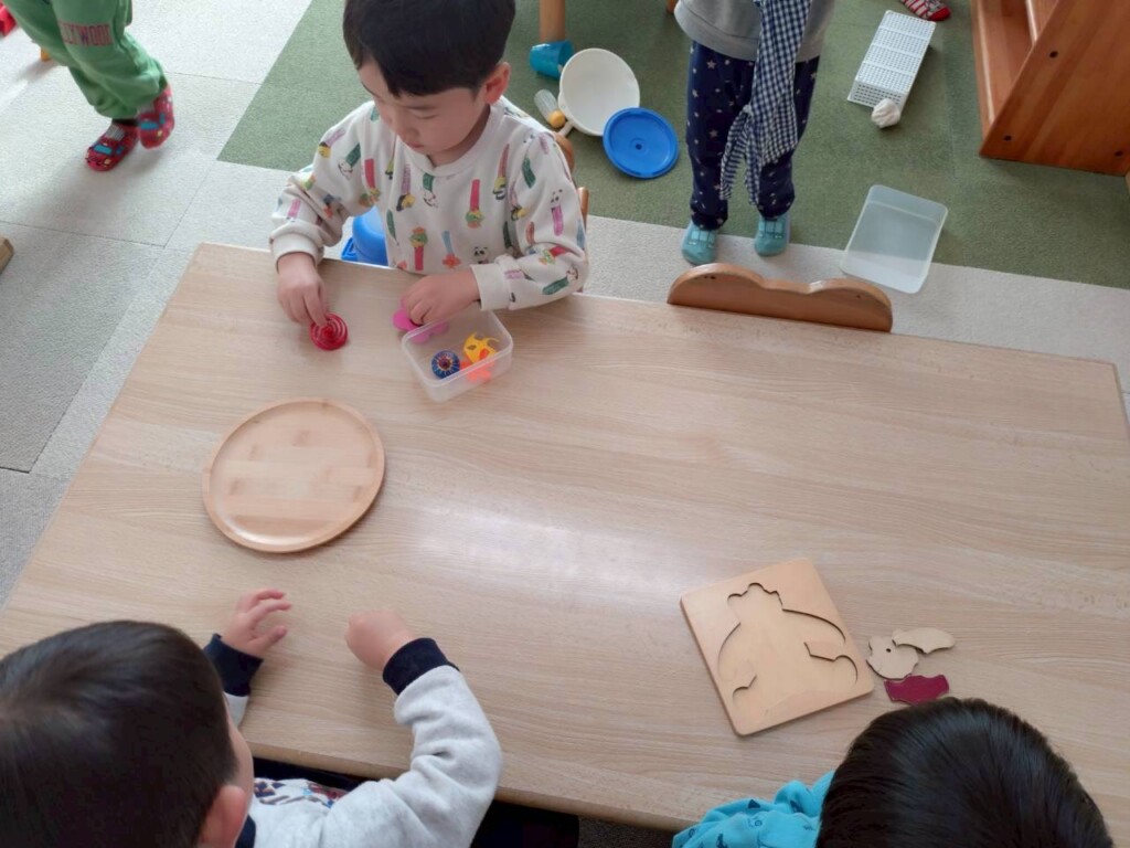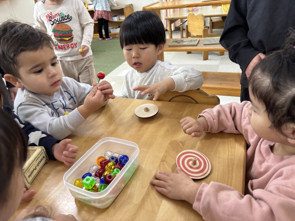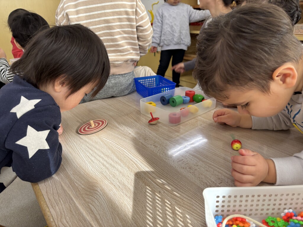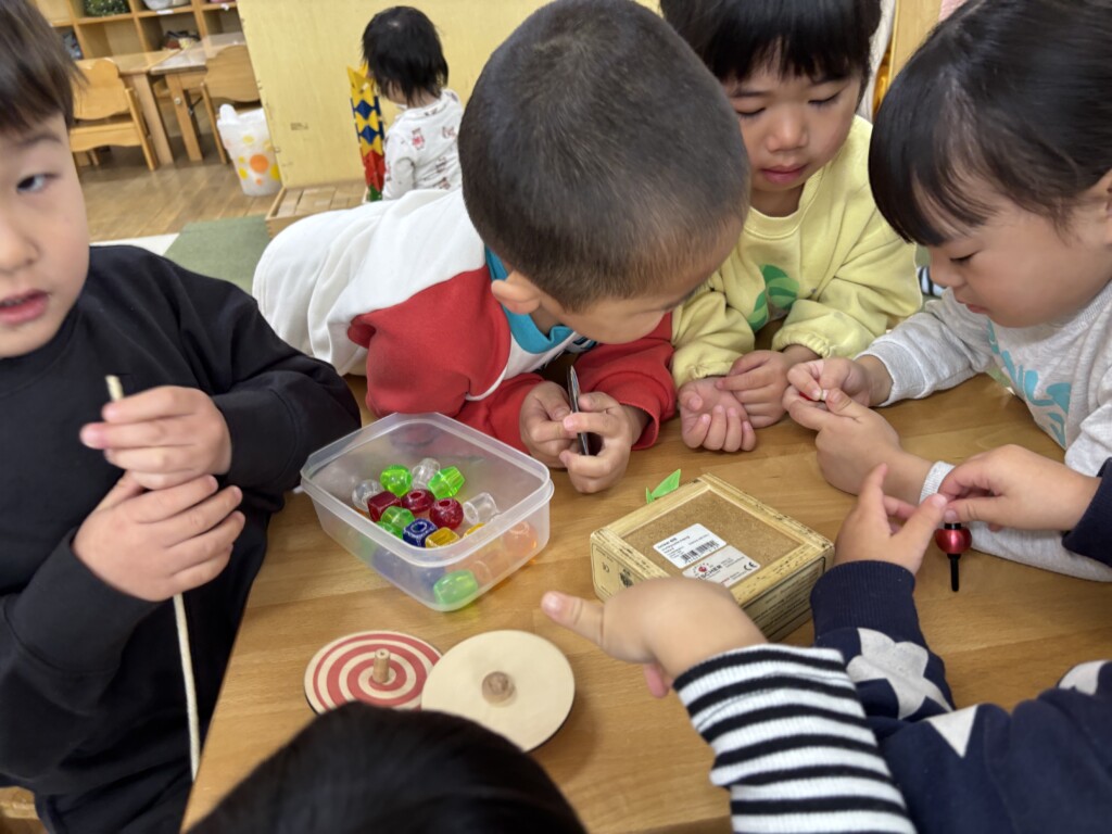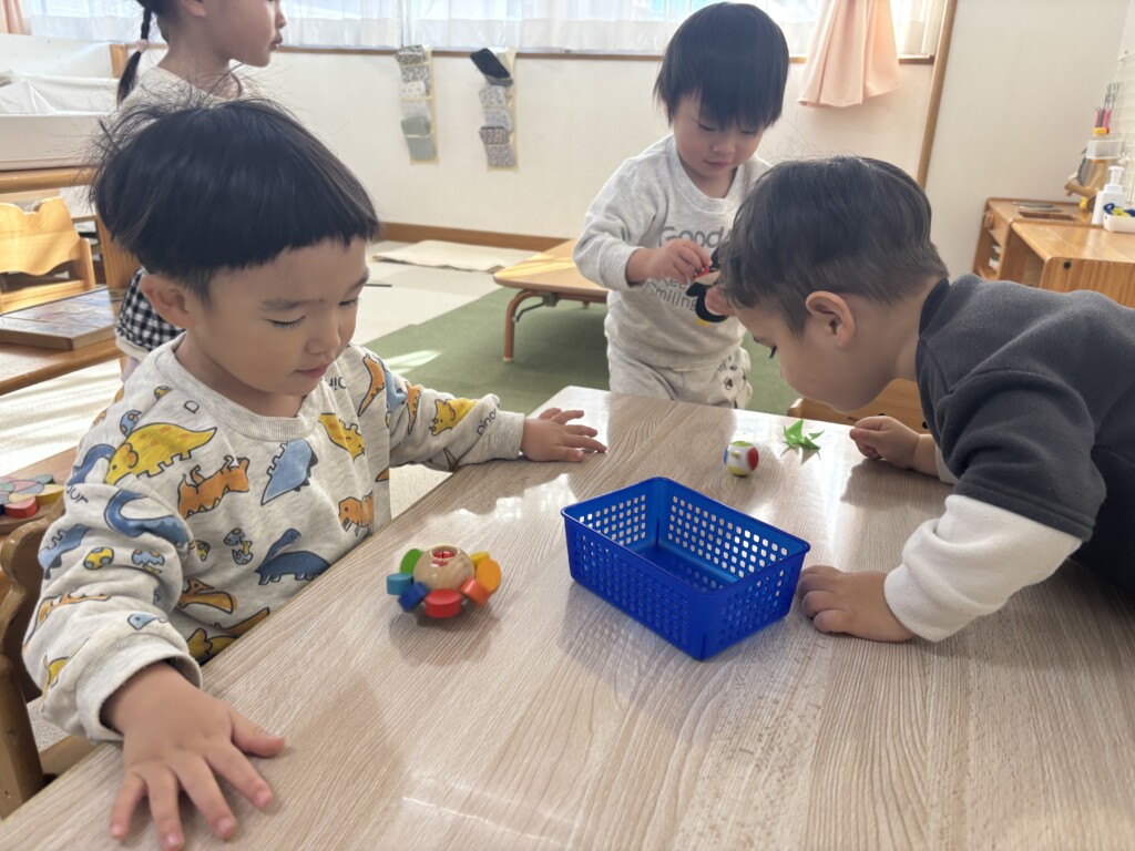 正月ならではの遊びとして、独楽回しを楽しんでいます。最初は上手く回らなかった子どもたちも、何度も挑戦するうちに少しずつコツをつかみ「見て!まわったよ!」と嬉しそうに見せてくれています。昔ながらの遊びに親しみながら楽しい時間を過ごしています。