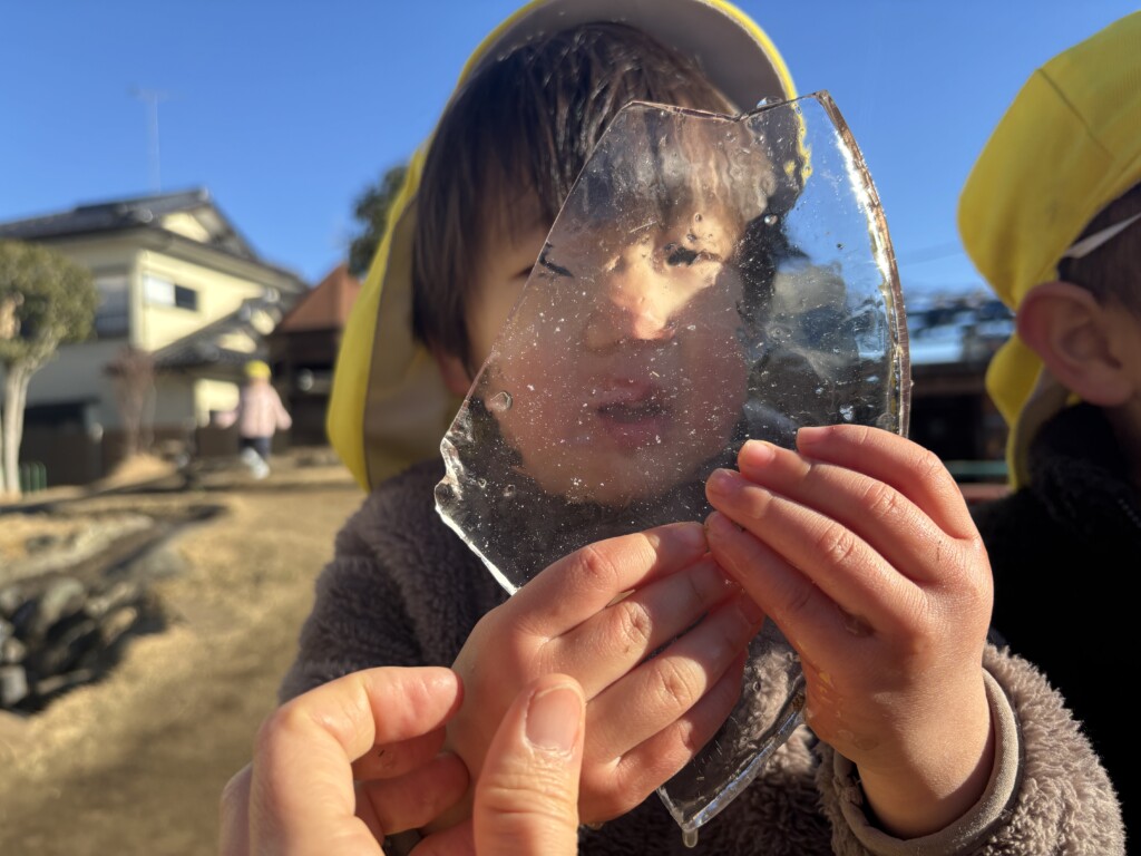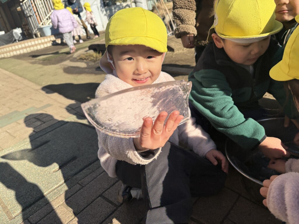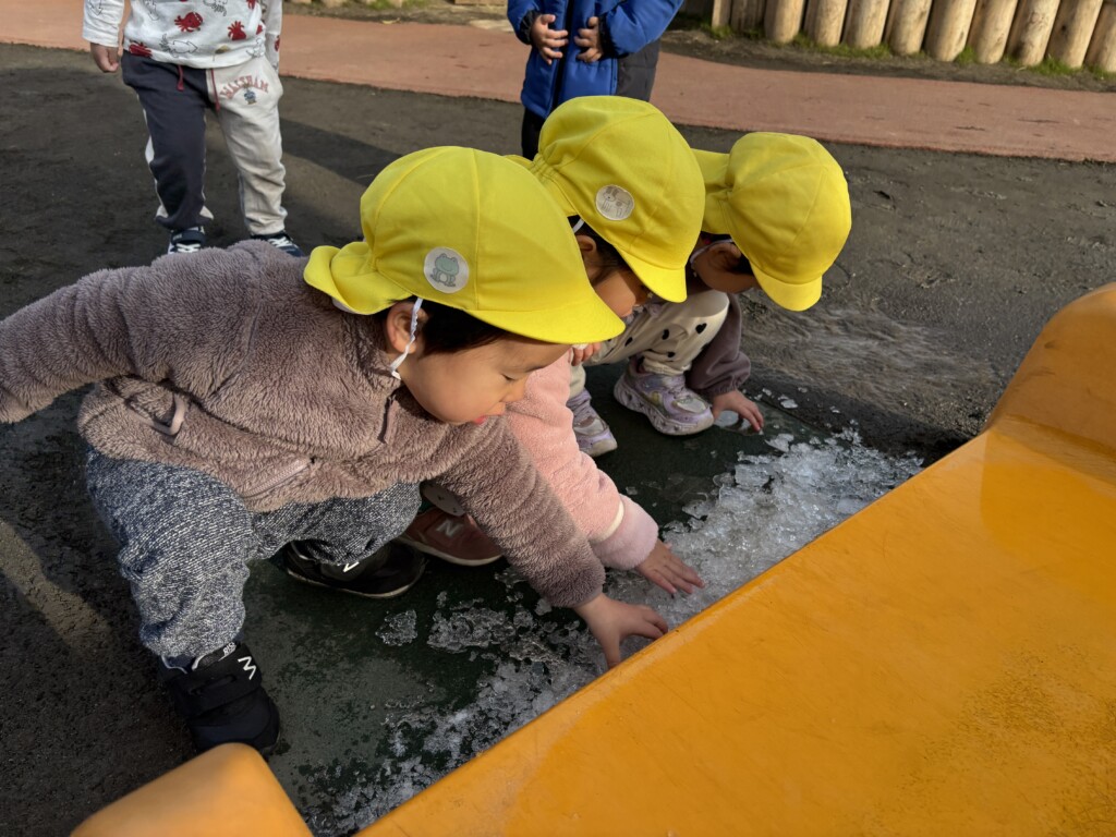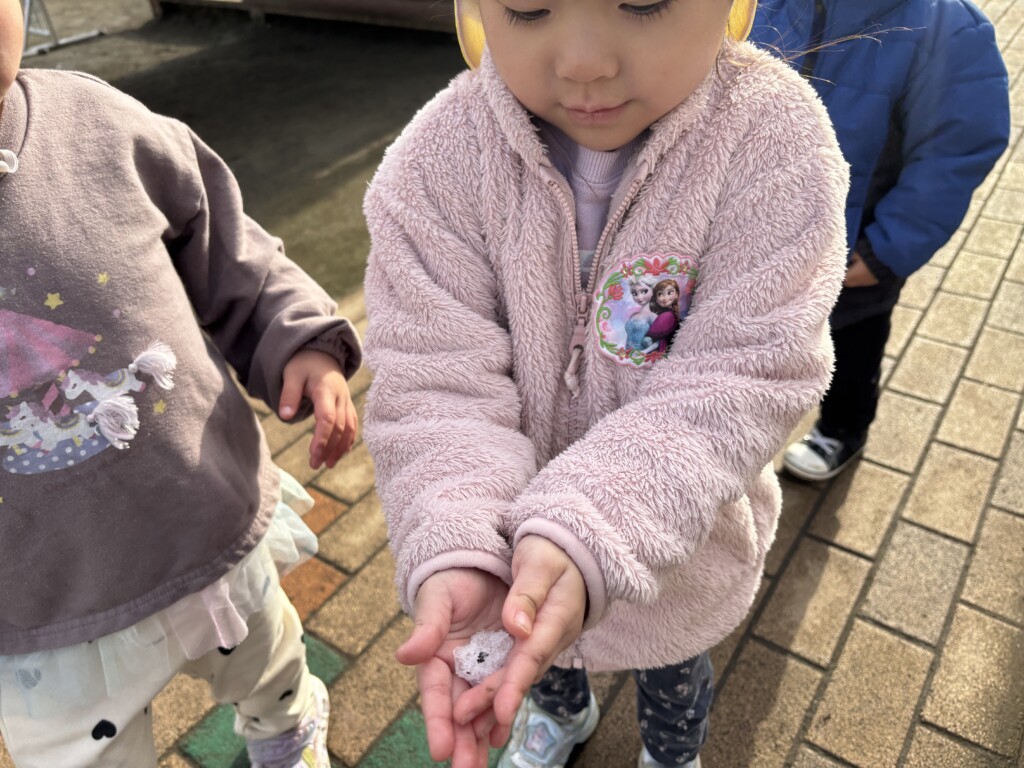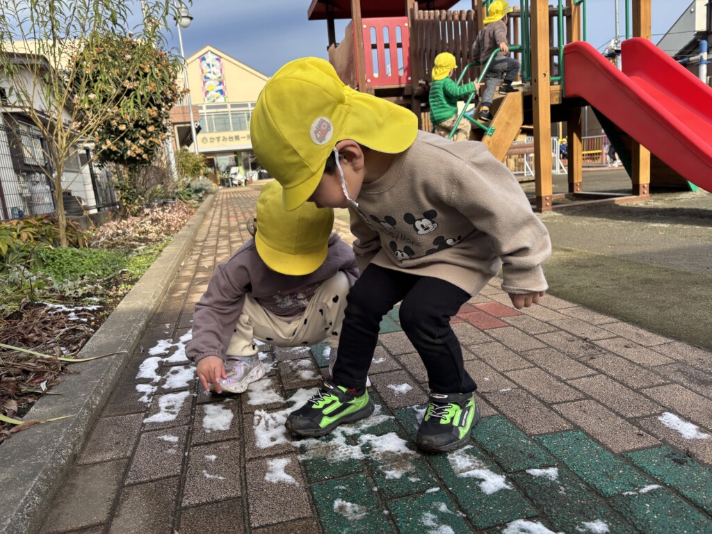 新しい年がスタートしました。子どもたちは園庭に出ると、正月休み中に降った雪に触れたり、足踏みをして感触を楽しんでいました。大きな氷も「つめたーい!」と言いながら、子どもの顔程ある大きな氷を触っていました。