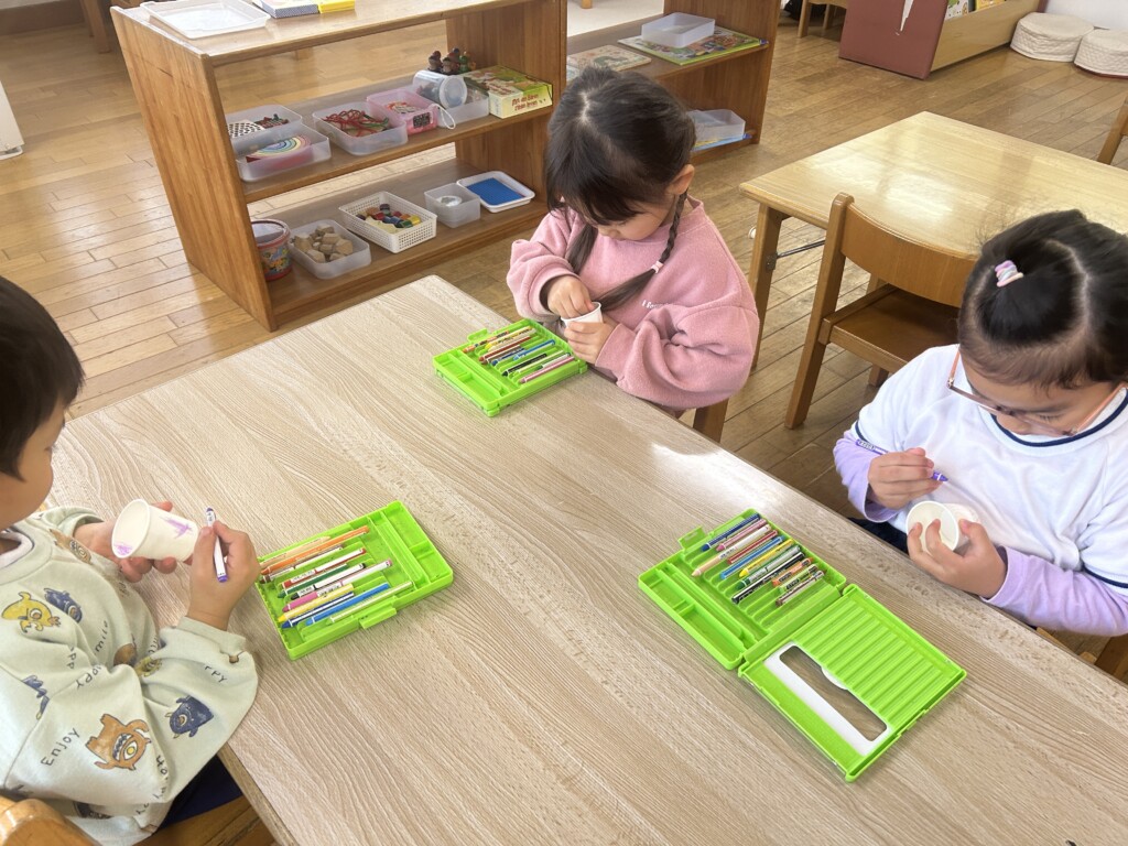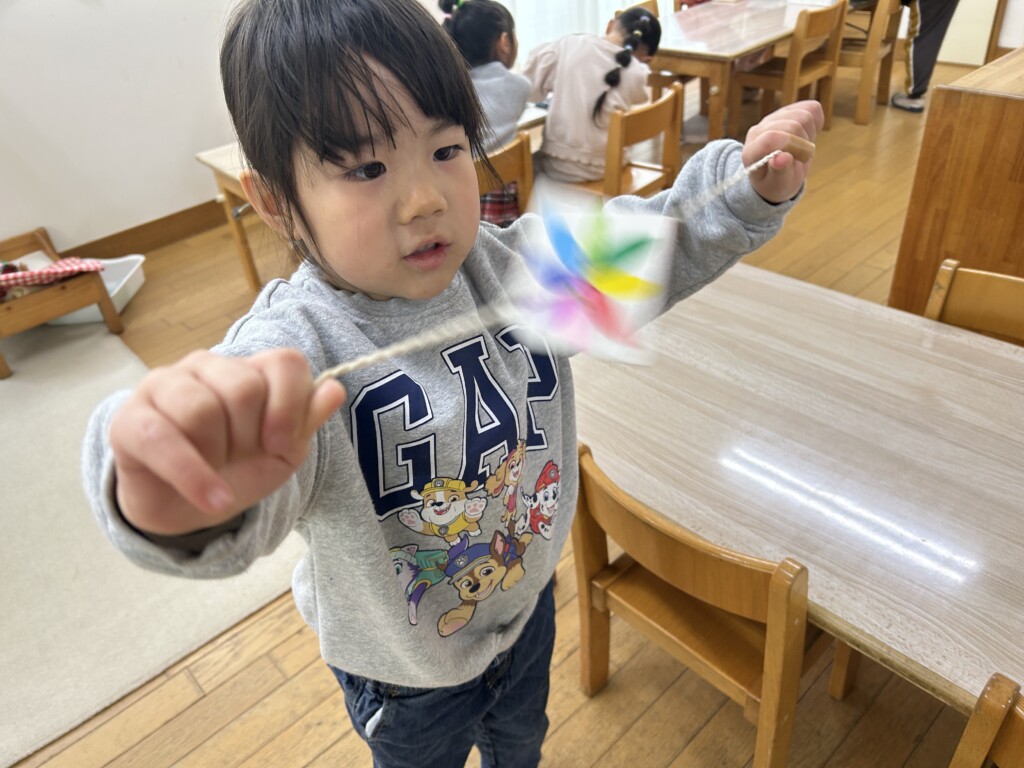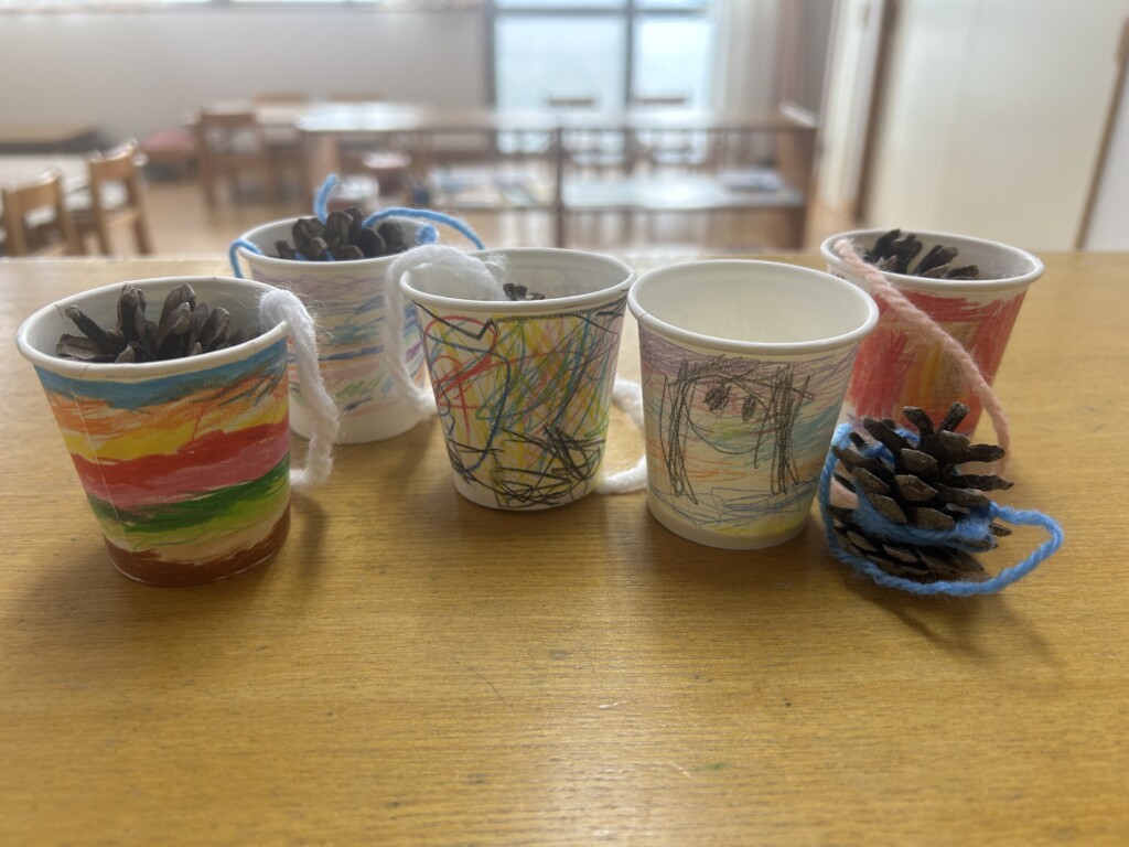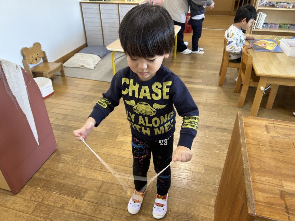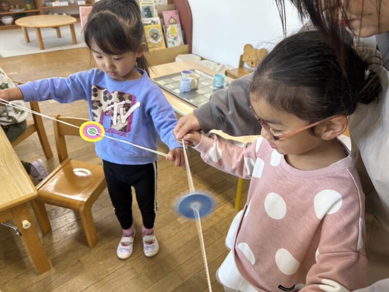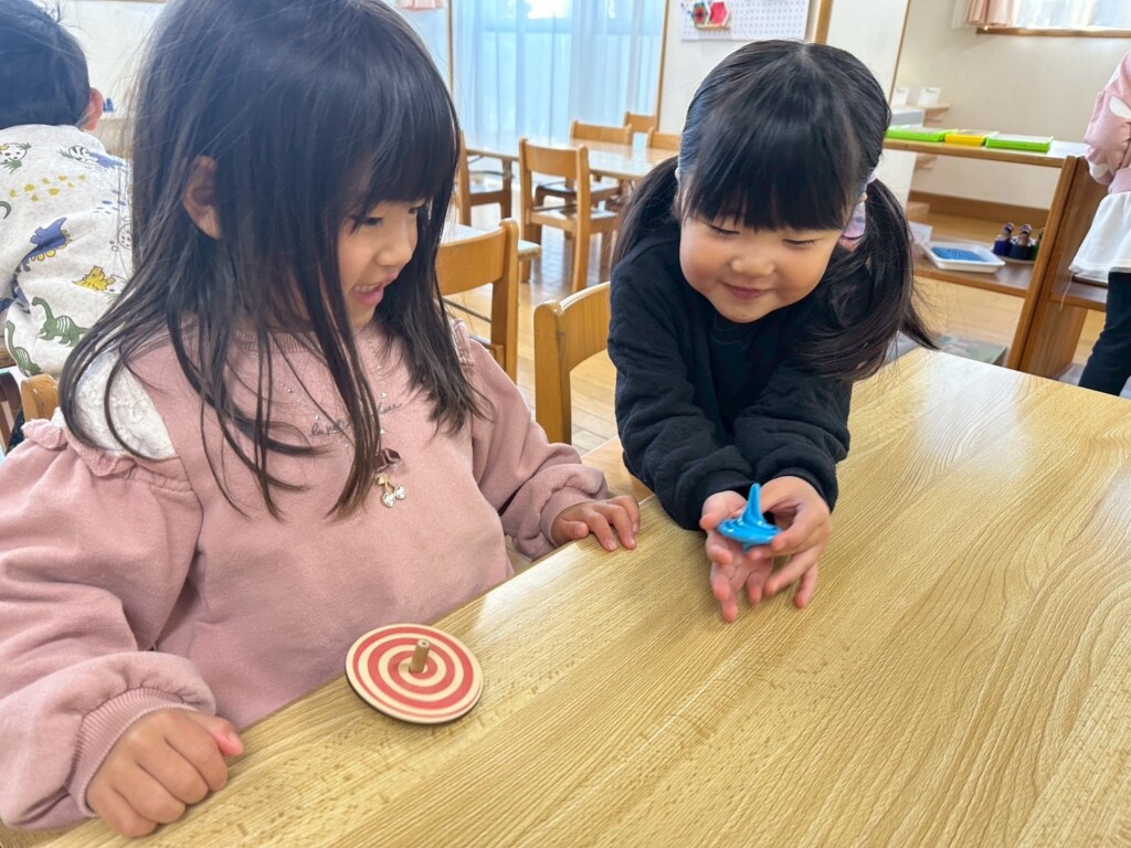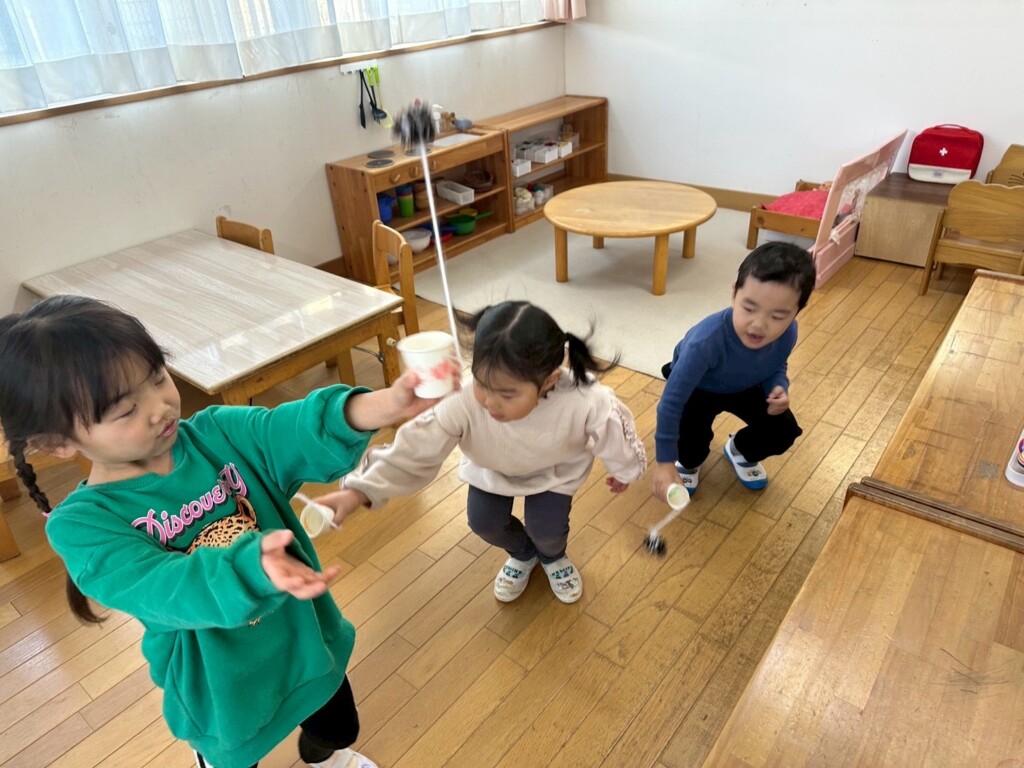 お正月も明け、子どもたちは更にパワーアップ!!そこで・・・子どもたちが楽しめそうな伝承遊びを用意し、皆で作ったり、遊んだりして、寒い日も夢中になって楽しみました。松ぼっくりと紙コップを使って手作りでけん玉を作ると、自分だけのオリジナルけん玉に子どもたちは大喜び。最初は「できなーい」と、保育士に訴える子もいましたが、粘り強く取り組んでいた子が「入ったーーー!」と成功の瞬間を皆で分かち合うと「すご~い」と言い、急にスイッチが入り・・・「僕も1回入った!」と成功の連鎖が続き、保育室はとっても賑やかでした。また、牛乳パックで作ったブンブンコマは、回し方のコツを掴むまでが忍耐・・・。そして、自分の力で回せた時の子どもたちの達成感に満ちた顔はとっても誇らしかったです。