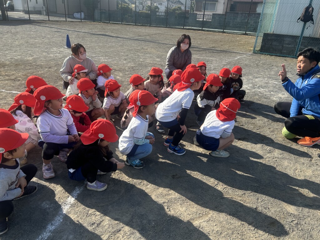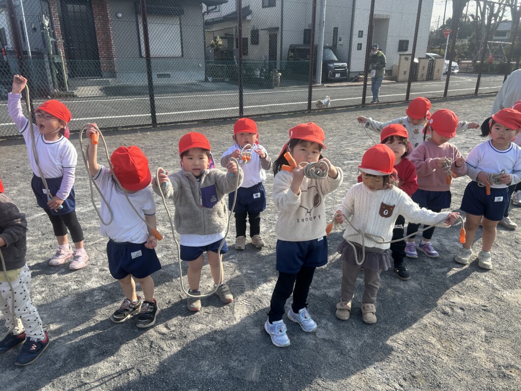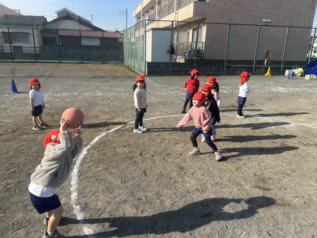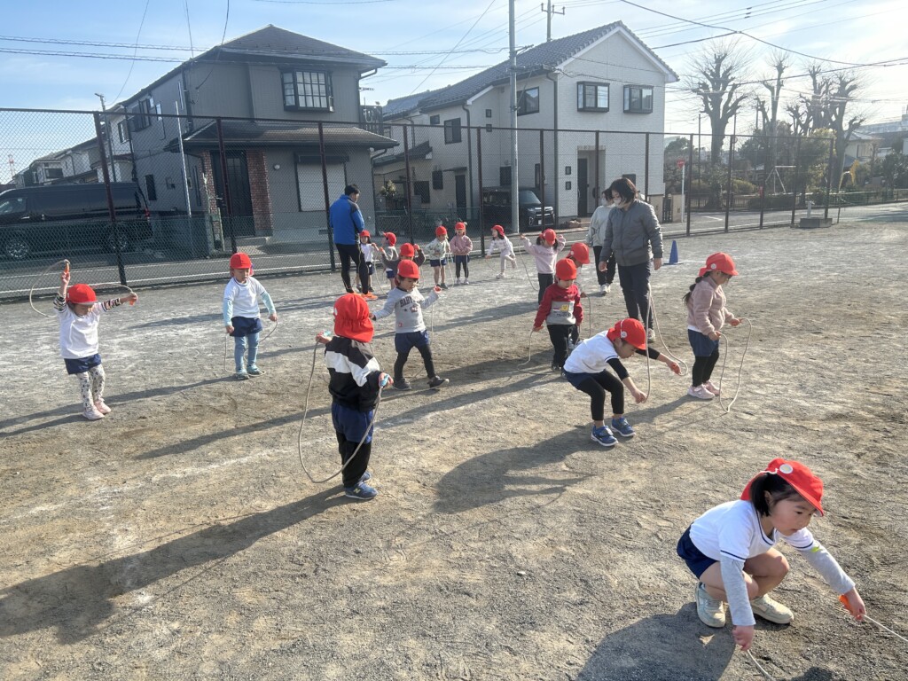「寒~い」と言いながらも体育講師が来ると、にこにこと支度を張り切る子どもたち、寒さで体を動かすことも少なくなりがちですので、まずはマラソンを・・・。ただ、走るだけではなく、走る時間、歩く時間など子どもたちに合わせて行っているので、子どもたちは疲れる様子もなく「負けないぞー」と言いながら、5周くらいグランド内を走っていました。そして、縄跳びは、先月から取り組んでいたので、縄のほどき方も上手になり、前跳びに繋がる運動を楽しみました。腕を回すだけではなく、肘の使い方がポイントになり、そのコツを掴んだ子たちは、以前にも増して、軽く縄を回せるようになってきました。最後は、ルールを理解しながら楽しむ「中当て」。まだ、ボールの扱い方がぎこちない子も多いですが、ルールを覚え、当てたい一心で夢中になって、ボールを投げたり、逃げたりと大盛り上がりでした。