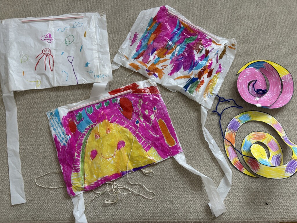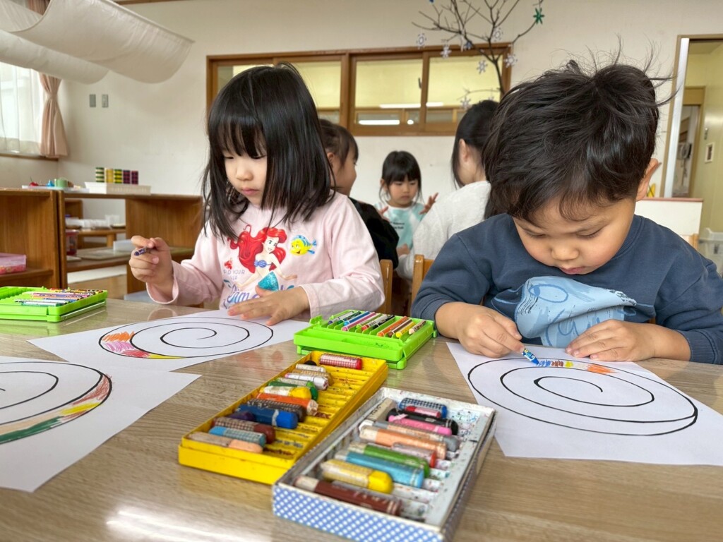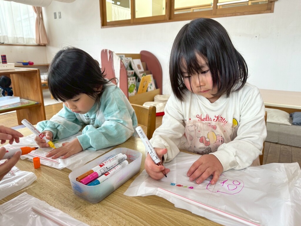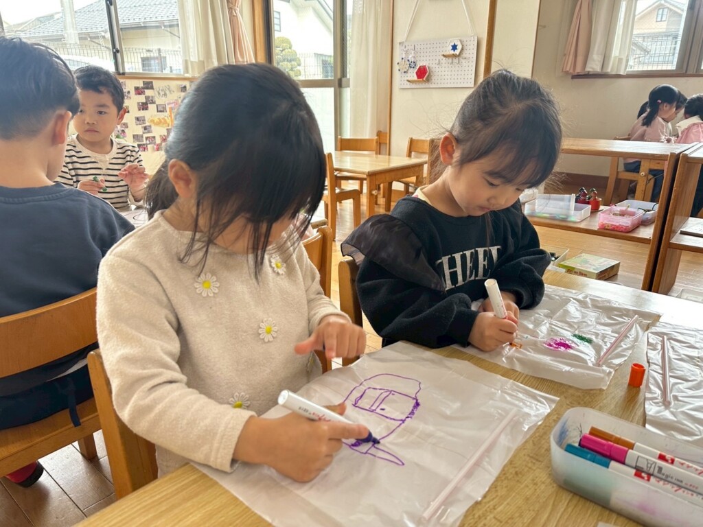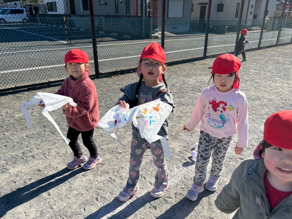 お部屋だけではなく、外でも伝承遊びを・・・と凧作りに挑戦!!ビニール袋に絵や模様を描く凧と、渦巻き状になる凧、好きな方を選んでオリジナル凧作りを楽しみました。そして、保育園前のグランドへいざ出発!走りながらも揚がる凧を見たくて友だちとぶつかりそうになるほど、子どもたちは凧に夢中!!「見て・飛んでるよ~」「クルクルしてる」と自分だけの凧を皆に披露しながら楽しい凧揚げの時間を満喫しました。凧揚げが楽しかったようで、「またやろうよ~」「お家でも凧揚げしたい」などと、帰り道の会話は盛り上がっていました。