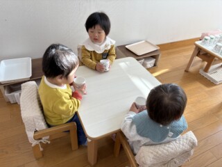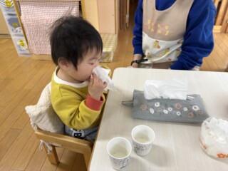 牛乳を飲んだ後保育士が口を拭いてあげていると、自然と自分で口を拭こうとする子が増えたのでテーブルの上にティッシュとごみ入れを用意しました。