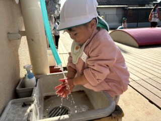 手を洗ってお部屋に入ります。「ごしごし」と手をこすり合わせ上手に手を洗っています。