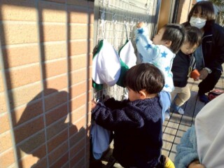 靴下、上着、帽子、靴を履いて芝生広場に向かいます。早く外で遊びたくて意欲的に支度に取り組んでいます。