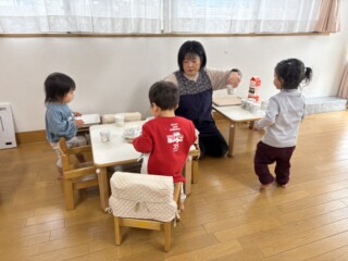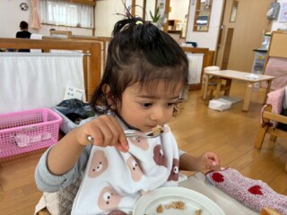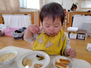 給食の子が増えてお友達と一緒に食事が楽しめるようになりました。お友達が美味しそうに食べている姿を見て食べる意欲がどんどん増しています。