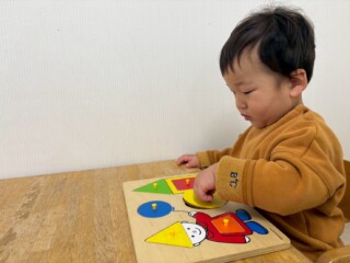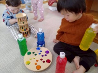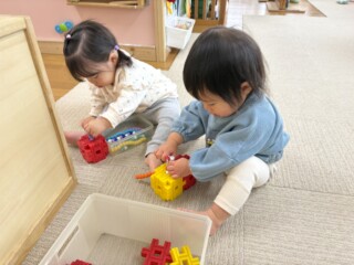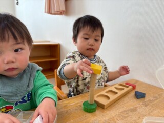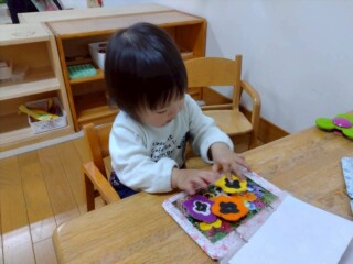 机上遊びでは、椅子に座って好きな遊びを集中して楽しんでいます。指先が器用になりいろいろな遊びが楽しめるようになりました。