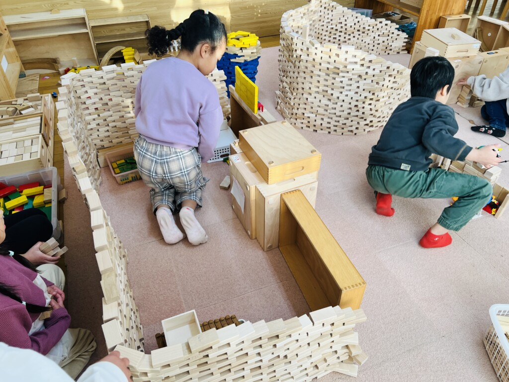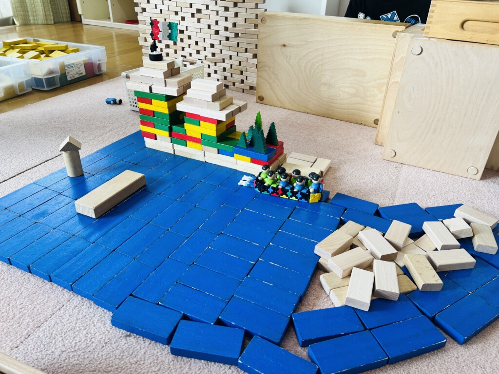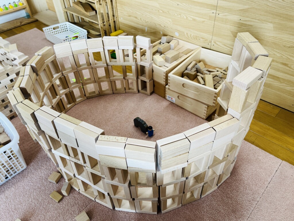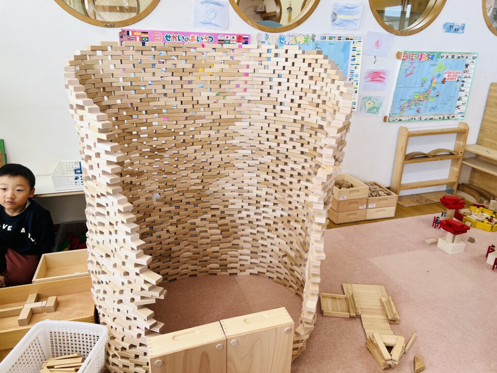 子ども達の中で「積木で大きな家作りたいね♬」という話題になり、頑張って数日間かけて完成していました。