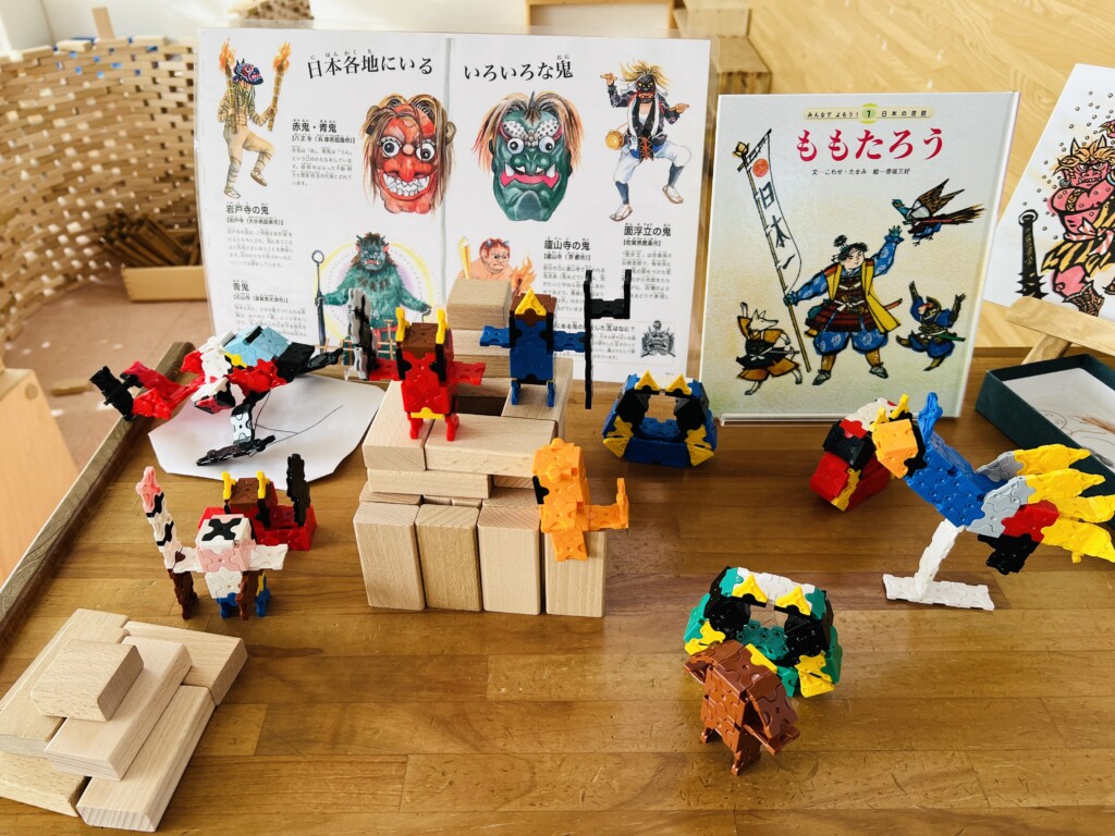 ラキューで作った作品は、絵本「桃太郎」の世界観になっていて、鬼ヶ島での戦いが表現されています😊