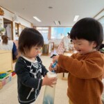 時には取り合いになってしまう事もありますが、そんなやりとりの中でも使っている玩具を貸してあげたり、待っててねと伝える事もあり、自分の思いを相手に伝えられています。
