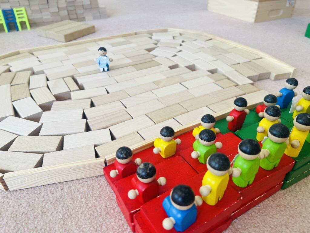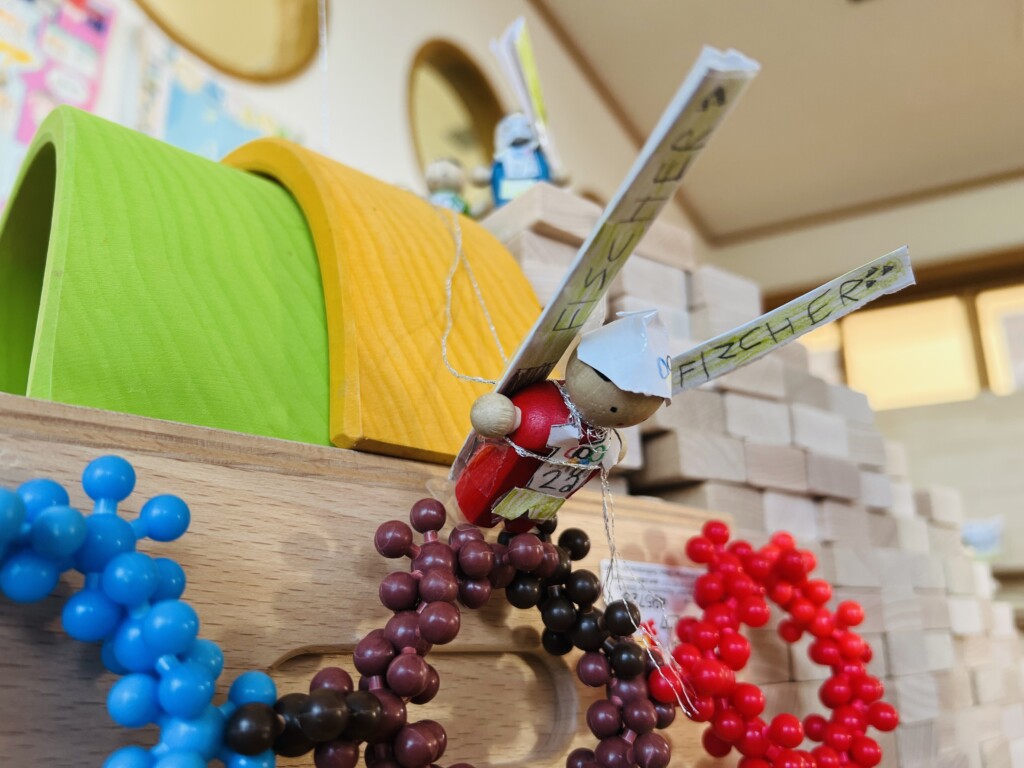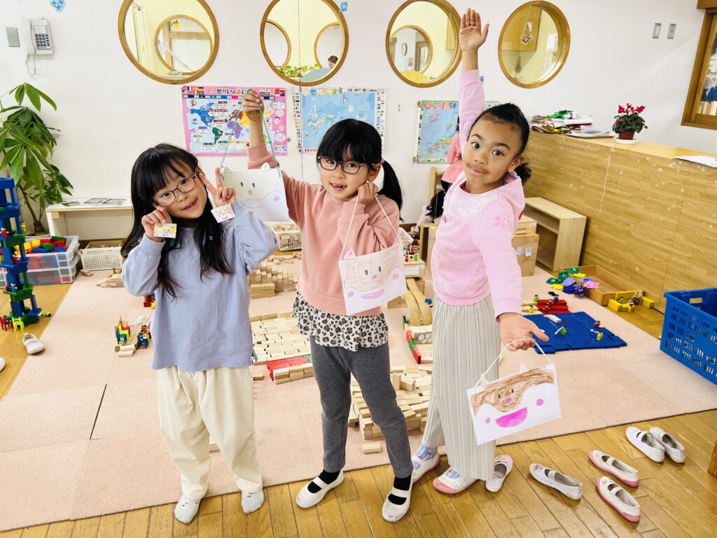 他にも公式キャラクターの「ティナとミロ」グッズの中に、トートバックがあることを知ると真似して作ってみたり、積木コーナー内に販売している様子を表現しており、オリンピックが閉幕するまで盛り上がりました。
