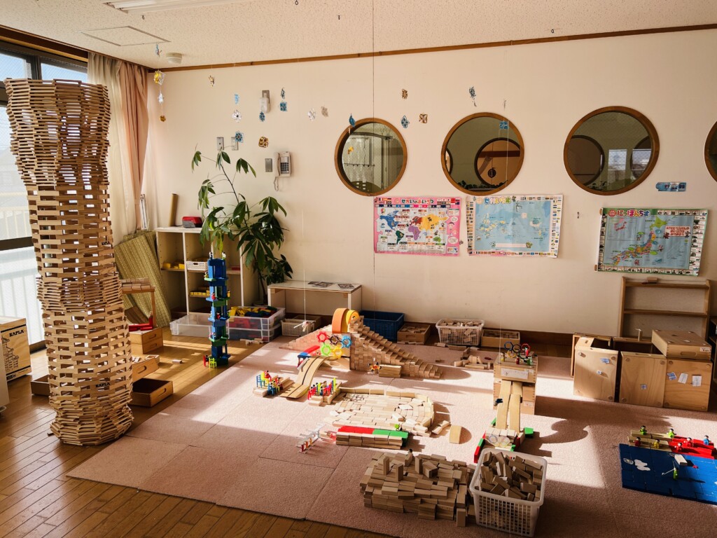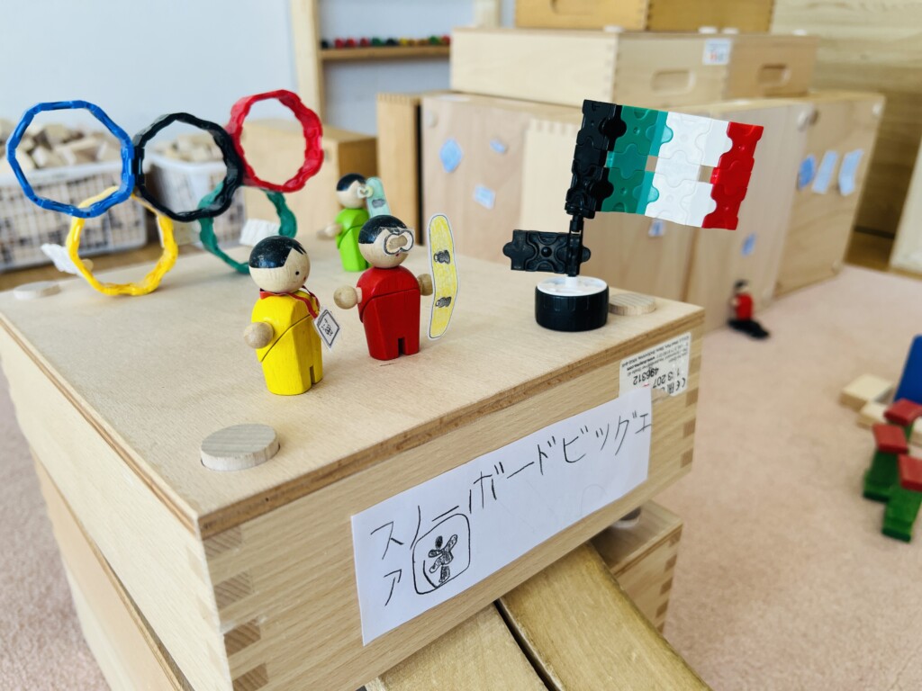 「オリンピックってすごいね!」と日本代表をはじめ、世界の人々が活躍する姿に興味を示した子ども達は、積木などを使って「スキージャンプ」や「スノーボードビックエア」、「フィギアスケート」、「カーリング」などオリンピック競技を表現していました。