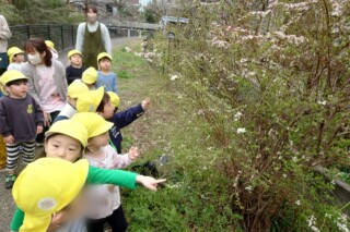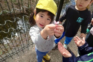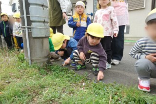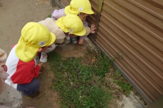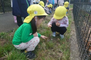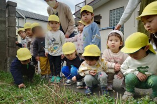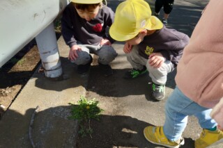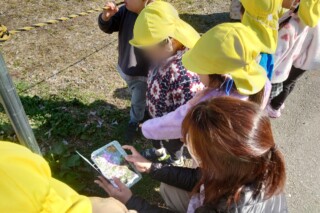 春探しの散歩に行きました。道端に咲いている野草に気づいて手作り図鑑で調べると、オオイヌノフグリやホトケノザ、ヒメオドリコソウにタンポポと発見を喜んでいた子どもたちです。