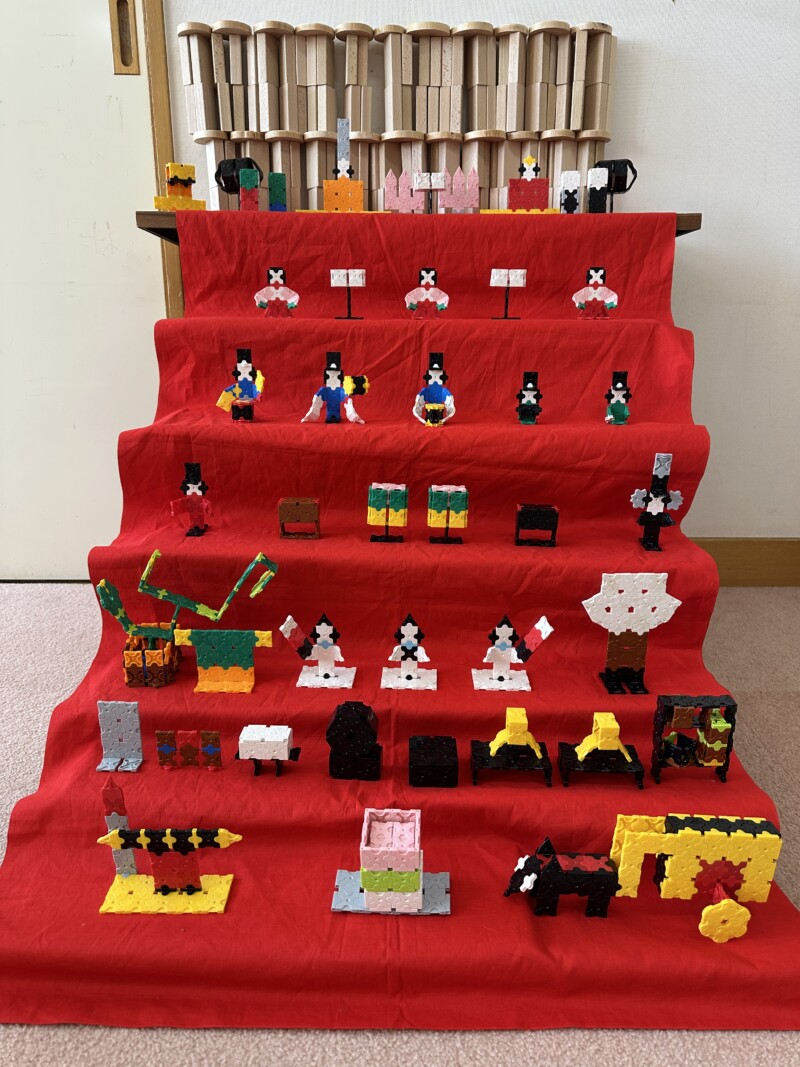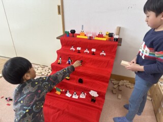 保育園に飾ってあるお雛様を、玩具を使って表現して遊んでいました。